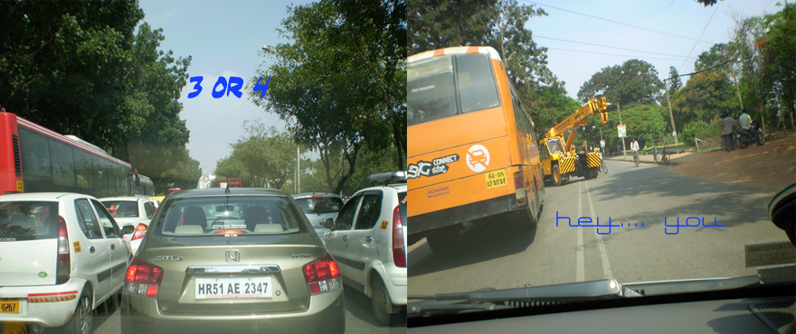 This is a story about the road traffic in Bangalore. When you were here last month for our Sweetie's Birthday, you would have experienced the terrific traffic. It is chaotic and confusing. This page is designed as if you're travelling in a car,(you have to turn and U turn ) you can see your position on the "Road map" shown on the bottom right of the page. Most of the pictures are shot by me while driving. You "feel" the traffic from a driver's seat.The above title shows the hectic traffic in Bangalore. The police are at their best, but in vain sometimes. The Bangalore Traffic Police have many Avatars and we show some of them in this story.