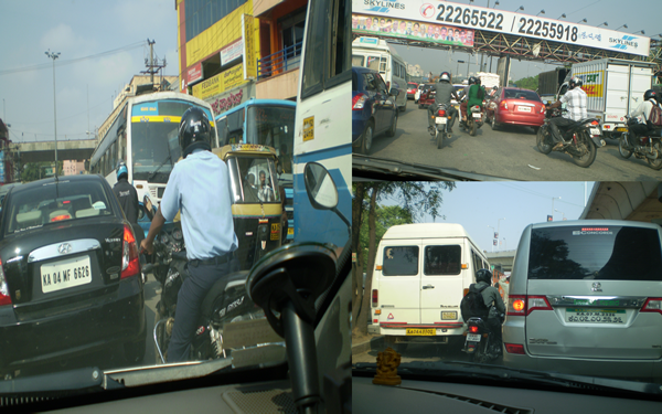 Left-Right-Center is in the inner mind of the motorists in Bangalore. See below the lane discipline is not observed. Four lines of vehicles in a three lane traffic, leads to the chaotic driving and accidents. Even if you are a careful driver, you will have surprises while driving, overtaking from left and turning right with out a proper signal and vice versa, sudden halt of BMTC buss in the middle of road to board the passengers, vehicles crossing on the wrong side with out any signal or alert.